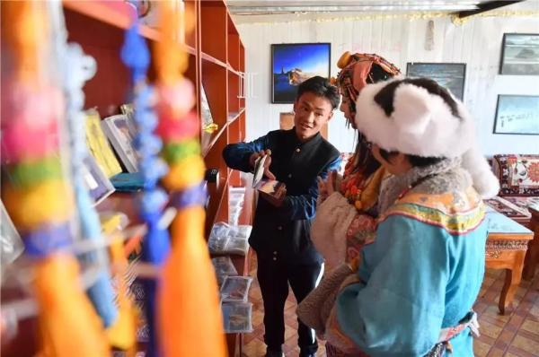 西藏自治區(qū)納木錯(cuò)自然保護(hù)區(qū)郵局,旦增洛珠(左)正在給游客介紹旅游產(chǎn)品。自農(nóng)村電商工作開(kāi)展以來(lái),西藏郵政已在全區(qū)各地(市)多個(gè)郵政營(yíng)業(yè)網(wǎng)點(diǎn)、便民服務(wù)站、小商超店、旅游景點(diǎn)等地建立“郵掌柜”、郵樂(lè)購(gòu)、郵樂(lè)網(wǎng)、天上西藏E郵等網(wǎng)上購(gòu)物和銷(xiāo)售系統(tǒng)。