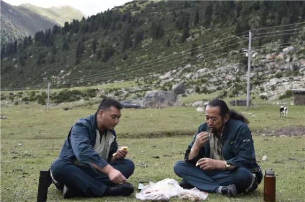 其美多吉與同事在雀兒山下席地而坐吃午餐