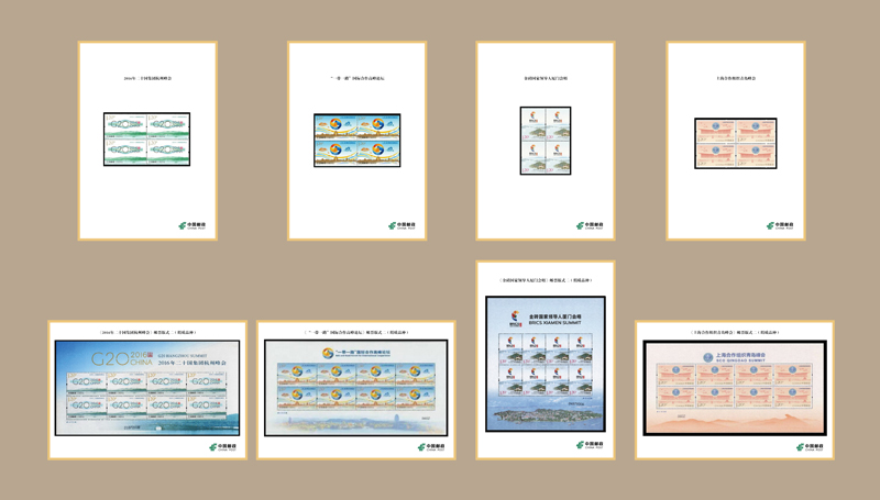 第九展柜展示的主題是“大國(guó)外交”,展現(xiàn)的是近年來(lái)我國(guó)主場(chǎng)重大外交活動(dòng),包括《二十國(guó)集團(tuán)領(lǐng)導(dǎo)人杭州峰會(huì)》《“一帶一路”國(guó)際合作高峰論壇》《金磚國(guó)家領(lǐng)導(dǎo)人廈門(mén)會(huì)晤》《上海合作組織青島峰會(huì)》。這四套郵票同時(shí)發(fā)行了絹質(zhì)版式。