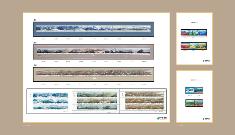 第十展柜的主題是“美麗中國(guó)”。選取《長(zhǎng)江》《黃河》《長(zhǎng)城》三套郵票和《美麗中國(guó)》(一)(二)組郵票。