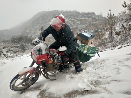 連日來,甘肅多地普降大雪,連續(xù)的風(fēng)雪惡劣天氣給正值高峰的“雙11”投遞工作帶來了嚴(yán)峻考驗(yàn),尤其是在路況很差的鄉(xiāng)村地區(qū)。但投遞員們不懼風(fēng)雪,全力以赴,準(zhǔn)確、及時(shí)地將一件件包裹送到用戶手中,至11月19日,甘肅郵政“雙11”進(jìn)口郵件妥投率為95%。圖為11月16日,慶陽市華池縣城壕鎮(zhèn)郵政所鄉(xiāng)郵員趙元瑞冒雪投遞。 □徐向釗 攝影報(bào)道