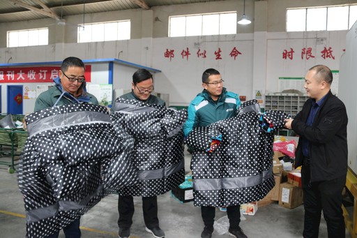 “這擋風被真厚實。”11月17日,河南省衛(wèi)輝市郵政分公司“三合一”郵件處理場地的投遞員們拿著新發(fā)放的棉帽子、棉手套、電動車擋風被等御寒保暖勞保用品感慨道?!鮿⑵G玲 攝