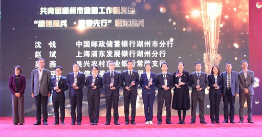 在浙江省湖州市金融系統(tǒng)近日舉辦的“建功新時代 金融青年說”演講比賽上,共青團湖州市委對湖州市“綠色金融青年先行”十大模范標(biāo)兵進行了表彰,郵儲銀行湖州市分行的沈錢(左六)獲得此項榮譽。