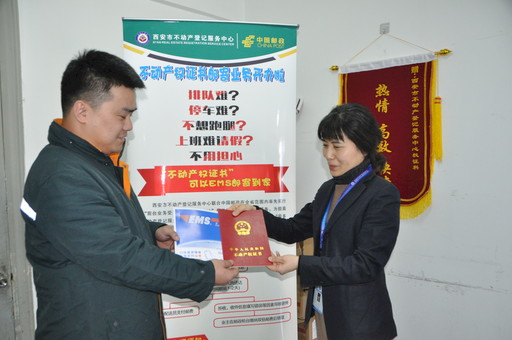 自11月29日起,陜西省西安市不動產(chǎn)登記服務中心正式受理群眾的不動產(chǎn)權證書郵寄業(yè)務,群眾在辦理二手房交易、房屋抵押注銷、權屬登記等業(yè)務時可提出郵寄服務申請,證書制作完成后可由EMS送達。這是西安市郵政寄遞事業(yè)部切入政府便民惠民工作、實現(xiàn)郵政便民服務的又一次拓展。圖為西安市不動產(chǎn)登記服務中心的工作人員將第一件要郵寄的證書交到EMS工作人員手中?! 鯊堁╃?nbsp; 攝影報道