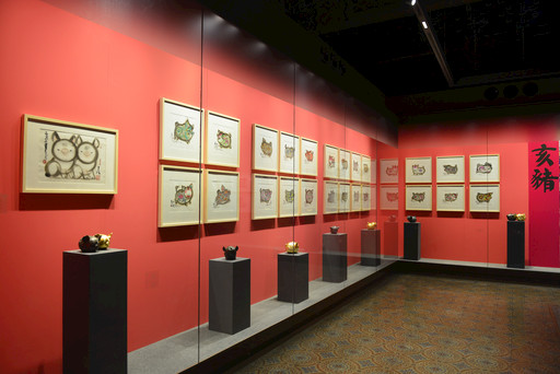 第一部分“生生不息”,意為“生肖輪回,生生不息”,不僅是指人類生命的生長(zhǎng)與繁殖,也喻指韓美林藝術(shù)創(chuàng)作的變化與創(chuàng)生。這部分的展品,以韓美林創(chuàng)作的十二生肖動(dòng)物作品為主,依照子、丑、寅、卯等十二生肖的排序,形成既連續(xù)又獨(dú)立的12個(gè)展示板塊。每一個(gè)板塊以一個(gè)生肖為主題,通過(guò)將韓美林相關(guān)的平面作品、立體作品以及陶瓷、紫砂、木雕、鐵藝等不同媒介的作品進(jìn)行展陳布置,既多樣豐富又統(tǒng)一整體。