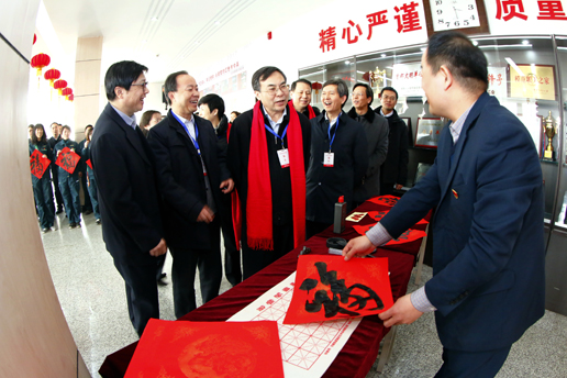 劉愛力觀看北京機(jī)要通信局員工書寫“?!弊郑瑸榇蠹宜蜕闲麓鹤8?/p>
