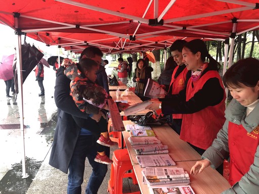 日前,浙江省義烏市郵政分公司12名黨員冒雨到市民廣場開展“公益廣角”志愿服務活動,為市民送上溫暖。