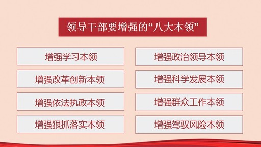 習近平總書記在黨的十九大報告中提出:“領導十三億多人的社會主義大國,我們黨既要政治過硬,也要本領高強?!笨倳浽趫蟾嬷袕娬{提出,要增強“八大本領”。黨課指出,“八大本領”是習近平總書記對所有黨員領導干部提出的要求,希望大家牢記在心,在工作中經(jīng)常對照、反復比較,不斷提升自我。