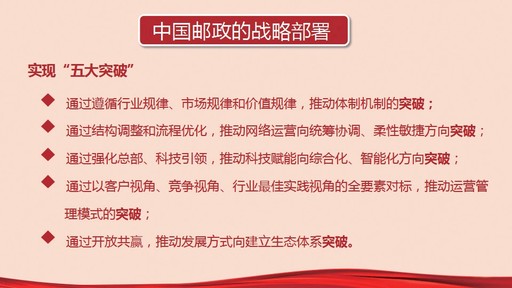 比如,對郵政寄遞業(yè)務,我們的戰(zhàn)略部署就是要聚焦“四大業(yè)務”,把握好“兩個原則,五個抓手,三步走戰(zhàn)略”。