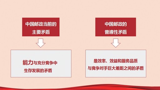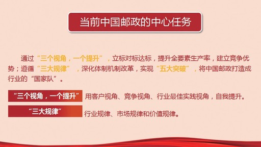 中國郵政當前的主要矛盾是什么?黨課提出,是能力與充分競爭中生存發(fā)展的矛盾。除了普遍服務以外,我們的所有業(yè)務全部是充分競爭的行業(yè),可我們的競爭力卻并不容樂觀。大家可以認真思考一下,我們寄遞業(yè)務的競爭力是什么?郵儲銀行的競爭力是什么?中郵保險的競爭力是什么?農(nóng)村電商有沒有競爭力?因此,中國郵政當前的中心任務就是要通過“三個視角,一個提升”(客戶的視角、競爭的視角、行業(yè)最佳實踐的視角,自我提升),立標對標達標,提升全要素生產(chǎn)率,建立競爭優(yōu)勢;遵循“三大規(guī)律”(行業(yè)規(guī)律、市場規(guī)律、價值規(guī)律),深化體制機制改革,實現(xiàn)“五大突破”,將中國郵政打造成行業(yè)的“國家隊”?!叭绻瓿刹涣诉@個中心任務,無論我們多么辛苦、多么努力,都將一事無成”。