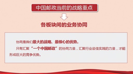 黨課關于中國郵政當前的戰(zhàn)略重點就是“各板塊間的業(yè)務協(xié)同”這一論述,讓人印象深刻,既有立足現(xiàn)代中國郵政發(fā)展的歷史視野、大局格局,又體現(xiàn)了基于新時代,基于高科技、大數(shù)據(jù)廣泛運用所帶來的新的危機與挑戰(zhàn)下的競爭力思考與選擇。黨課強調,協(xié)同是中國郵政最大的戰(zhàn)略、最核心的優(yōu)勢。協(xié)同的作用是整體遠遠大于部分的簡單加總,但更多的時候是n次冪關系。只有匯聚“一個中國郵政”的協(xié)同力量,匯聚行業(yè)最佳實踐的力量,才能形成巨大的競爭優(yōu)勢。