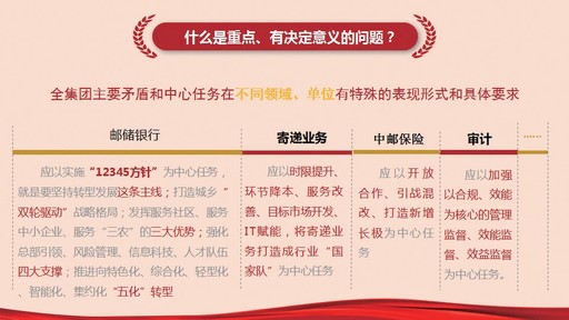 比如,郵儲銀行面臨哪些挑戰(zhàn)?寄遞業(yè)務面臨哪些挑戰(zhàn)?保險業(yè)務面臨哪些挑戰(zhàn)?我們的普遍服務面臨哪些挑戰(zhàn)?了解了這些主要矛盾,還要明確解決的方案和具體措施,明確我們的中心任務。比如對郵儲銀行,我們提出要以實施“12345”的工作思路作為中心任務,就是要堅持轉型發(fā)展這條主線,打造城鄉(xiāng)“雙輪驅動”戰(zhàn)略格局,發(fā)揮服務社區(qū)、服務中小企業(yè)、服務“三農(nóng)”的三大優(yōu)勢,強化總部引領、風險管理、信息科技、人才隊伍四大支撐,推進向特色化、綜合化、輕型化、智能化、集約化“五化”轉型;對寄遞業(yè)務,要以“時限提升、環(huán)節(jié)降本、服務改善、目標市場開發(fā)、IT賦能”的思路,將寄遞業(yè)務打造成“國家隊”作為中心任務;對中郵保險,要以開放合作、引戰(zhàn)混改、打造成新的增長極作為中心任務。還有審計工作,要以加強以合規(guī)、效能為核心的管理監(jiān)督、效能監(jiān)督、效益監(jiān)督為中心任務。