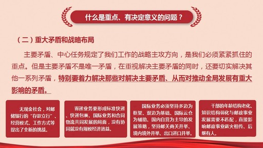 那么,中國郵政的普遍矛盾又是什么?黨課認為是效率、效益和服務品質與競爭對手巨大差距之間的矛盾,所有的板塊都存在著這樣一個普遍性的矛盾。所以,我們一定要知道矛盾的普遍性、矛盾的特殊性,抓住了主要矛盾這個牛鼻子,其他問題就迎刃而解。我們要堅決貫徹落實好新發(fā)展理念,堅持質量第一、效益優(yōu)先,這是中國郵政行動的指南。