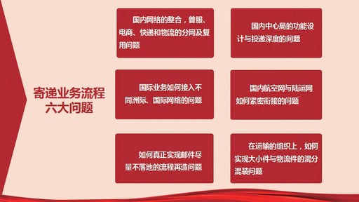 我們現(xiàn)在在流程方面主要有六大問題,大家一定要認真研究解決。一是國內網(wǎng)絡的整合,普服、電商、快遞和物流的分網(wǎng)及復用問題。哪些地方需要分網(wǎng)?是基于流量還是基于客戶不同的需求?到底怎么辦?德國郵政DHL有完全獨立的四大公司,是四個獨立的法人,但是DHL在德國農(nóng)村仍然是一個網(wǎng)絡服務,我們怎么辦?二是國內中心局的功能設計與投遞深度的問題。要研究是不是需要一個個孤立的分揀中心,然后經(jīng)過三次、四次分揀,不停落地?要不要集包?能不能直接分揀到段道口?三是國際業(yè)務如何接入不同洲際、國際網(wǎng)絡的問題。四是國內航空網(wǎng)與陸運網(wǎng)如何緊密銜接的問題。DHL在萊比錫有一個分揀中心,他們的航運中心一邊坐著陸運的人,一邊坐著空運的人,中間坐著所謂的管理層,天氣預報的大屏幕就在后面,一旦出現(xiàn)問題,比如哪個國際方向不能飛了,改陸路怎么改,幾個部門的人一協(xié)商,馬上進行車輛調度,然后就可以從空運轉陸運,同樣可以實現(xiàn)次日遞或者隔日遞。而我們南京集散中心,有沒有陸運的人?空運和陸運怎么結合?不能因為天上打個雷,飛機不能落地就不運了,結果客戶寄的櫻桃爛了,草莓也爛了。五是如何真正實現(xiàn)郵件盡量不落地的流程再造問題,我們這里說的11個環(huán)節(jié)、18個過程,實際上還不止這些,中間還有幾次分揀。六是在運輸?shù)慕M織上,如何實現(xiàn)大小件與物流件的混分混裝問題。這些問題都是影響我們生產(chǎn)效率的核心問題,大家一定要認真研究解決。所以,我們說首先要解決“有人看、有人干”的問題,就是要讓大家多看報表、多找問題,然后研究解決改善的辦法。