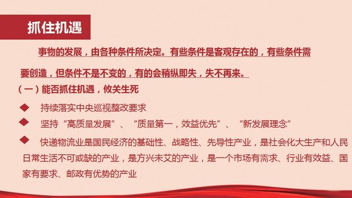 能否抓住機遇,攸關生死。當前,我們要以持續(xù)落實中央巡視整改要求為契機,認真查找企業(yè)改革發(fā)展中存在的問題,以整改促發(fā)展,堅持問題導向,堅持高質量發(fā)展,堅持質量第一、效益優(yōu)先,堅持新發(fā)展理念,努力打造行業(yè)的“國家隊”。比如,快遞物流業(yè)是支撐國民經(jīng)濟發(fā)展的基礎性、戰(zhàn)略性、先導性產(chǎn)業(yè),是社會化大生產(chǎn)和人民日常生活不可或缺的產(chǎn)業(yè),是方興未艾的產(chǎn)業(yè),是一個市場有需求、行業(yè)有效益、國家有要求、郵政有優(yōu)勢的產(chǎn)業(yè),我們必須搶抓機遇、加快發(fā)展,否則,我們就會徹底丟掉這個市場,丟掉核心業(yè)務,郵政何以立足。