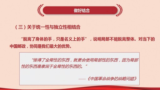 所謂戰(zhàn)略思維,就是關于實踐活動的全局性思維,是領導干部必備的素質。黨課指出,只要有組織,就有組織工作的全局,凡是帶有統(tǒng)籌兼顧各方面、各階段、各類人性質的工作,都是一個全局性的工作。集團公司可以是工作的一個全局,一個省分公司也可以是工作的一個全局,一個地市分公司也可以是工作的一個全局。在企業(yè)發(fā)展中,各項工作都不是孤立的,一定是相互影響、相互促進、相互受益的。中國郵政各級單位都是典型的具有全局性特點的組織,都需要協(xié)調好普遍服務、快遞物流、金融業(yè)務、農(nóng)村電商等各項業(yè)務發(fā)展工作。