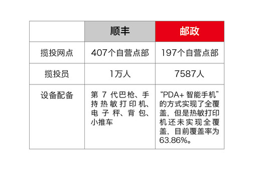 不只在網(wǎng)運(yùn)方面,郵政在攬收、投遞等環(huán)節(jié)上與競爭對(duì)手也存在差距。從攬收能力上來說,以河北為例,順豐有攬投網(wǎng)點(diǎn)407個(gè),郵政寄遞事業(yè)部有269個(gè);順豐有一線攬投員1萬人,寄遞事業(yè)部有7587人。在設(shè)備配備方面,順豐配有第7代巴槍、手持熱敏打印機(jī)、電子秤、背包、小推車;河北郵政通過“PDA+智能手機(jī)”的方式實(shí)現(xiàn)了全覆蓋,但是熱敏打印機(jī)還未實(shí)現(xiàn)全覆蓋,目前覆蓋率為63.86%。(見圖表2)