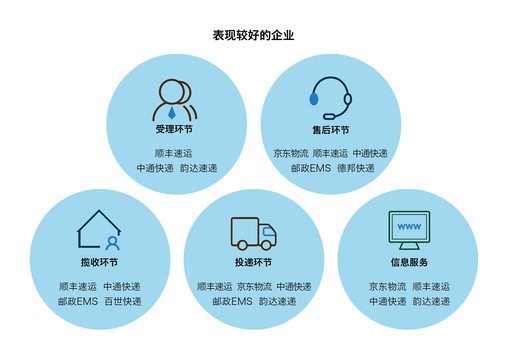 4月24日,國家郵政局發(fā)布了關(guān)于2019年第一季度快遞服務(wù)滿意度調(diào)查和時(shí)限準(zhǔn)時(shí)率測(cè)試結(jié)果的通告,在快遞企業(yè)公眾滿意度方面,得分在80分以上的企業(yè)為順豐速運(yùn)、京東物流,得分在76-80分之間的企業(yè)為郵政EMS、中通快遞、韻達(dá)速遞、申通快遞、圓通速遞和百世快遞。(見圖表3)在此之前,國家郵政局發(fā)布2018年快遞服務(wù)用戶滿意度、時(shí)限準(zhǔn)時(shí)率調(diào)查結(jié)果??爝f企業(yè)總體滿意度排名依次為:順豐速運(yùn)、郵政EMS、京東物流、中通快遞、韻達(dá)速遞、圓通速遞、百世快遞、申通快遞、德邦快遞、優(yōu)速快遞。在受理環(huán)節(jié)表現(xiàn)較好的企業(yè)有:順豐速運(yùn)、中通快遞和韻達(dá)速遞;在攬收環(huán)節(jié)表現(xiàn)較好的企業(yè)有:順豐速運(yùn)、中通快遞、郵政EMS、百世快遞;投遞環(huán)節(jié)表現(xiàn)較好的企業(yè)有:順豐速運(yùn)、京東物流、中通快遞、郵政EMS、韻達(dá)速遞;售后環(huán)節(jié)表現(xiàn)較好的企業(yè)有:京東物流、順豐速運(yùn)、中通快遞、郵政EMS和德邦快遞。信息服務(wù)方面表現(xiàn)較好的企業(yè)有:京東物流、順豐速運(yùn)、中通快遞、韻達(dá)速遞。(見圖表4)