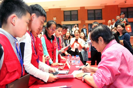5月10日,“與藝術(shù)大師面對面”韓美林上海郵迷見面會在上海市郵政分公司郵政大樓中庭舉行。見面會上,韓美林講述了自己的“郵票情緣”,并為從四面八方趕來的各個年齡段的郵迷在己亥年生肖郵品和集郵文化叢書《美林郵緣》上簽名,還特地為多位“資深郵迷”手繪生肖豬。一位排了3小時隊拿到大師簽名的年輕郵迷激動地說:“我特地連夜從杭州乘火車趕來,能夠一睹大師風(fēng)采,覺得特值?!眻D為韓美林為慕名前來的《小主人報》的小記者們簽名?! 跎虾S浾?nbsp; 周煉 攝影報道