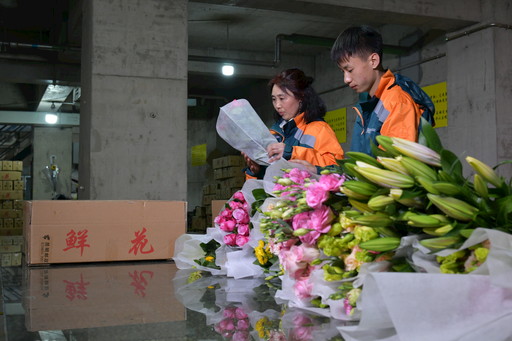 鮮花寄遞創(chuàng)客團(tuán)隊的郵政“小哥哥”“小姐姐”正在認(rèn)真包裝鮮花。
