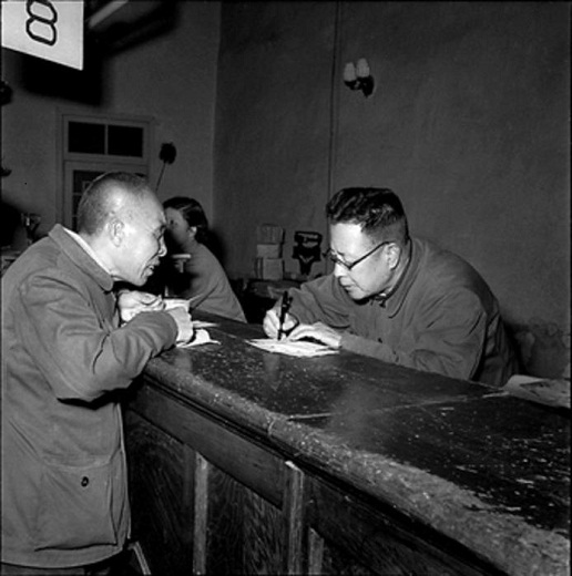 1958年4月,北京東四郵電局,在郵局工作了30多年的于鴻澤(圖右)積極為顧客填寫單據(jù)。工人日報 杜治 攝