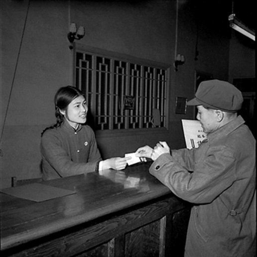 1958年4月,北京東四郵電局,營業(yè)員廉旻(圖左)主動向顧客介紹業(yè)務(wù)。當年,東四郵電局涌現(xiàn)出了常秀珍、沈秀敏、章秀敏、喬秀蘭和廉旻優(yōu)秀服務(wù)群體,人稱“四秀一廉”。 工人日報 杜治 攝