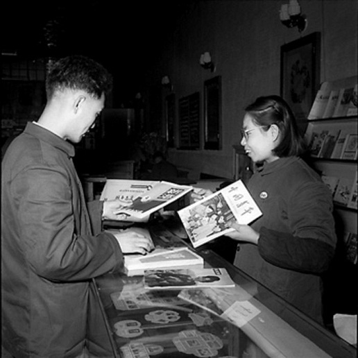1958年4月,北京。沈秀敏(圖右)對顧客很熱情,她總是拿著各種雜志主動向顧客介紹。工人日報 杜治 攝