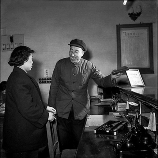 1958年4月,北京市郵局東城區(qū)局長兼黨總支書記劉桂馨(右),在東四郵電局指導營業(yè)員工作。工人日報 杜治 攝