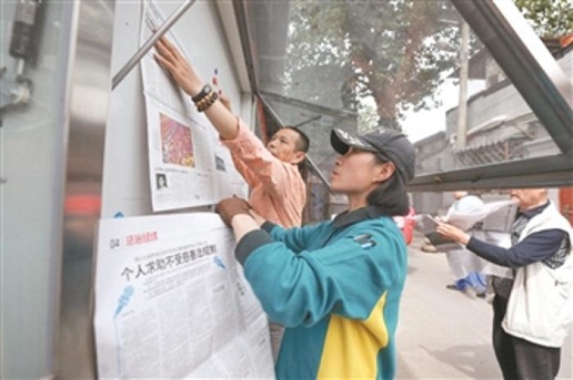 5月8日,劉小梅幫助社區(qū)志愿者在第一時間更換閱報欄的報紙。