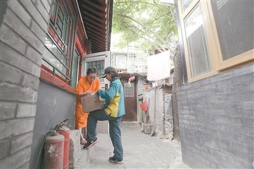 6月4日上午10時,天降小雨,劉小梅已經(jīng)開始當天的第二趟投遞。在一胡同口,劉小梅和認識的當?shù)刈舸蛘泻簟?br />