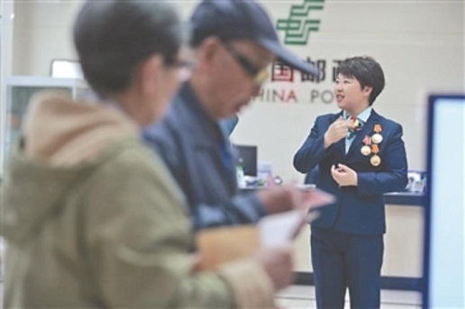 4月15日,在東四郵局營業(yè)廳,陳蘭穎為用戶答疑解惑。