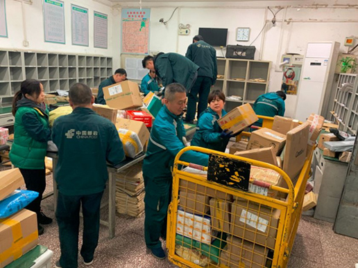 東四郵局北新橋投遞部的郵遞員們開始分揀新到的包裹(央廣記者 馮會(huì)玲攝)
