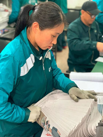 東四郵局投遞部的早晨是從7點(diǎn)開始的。砸郵戳、數(shù)報(bào)紙、分信件,忙而不亂。幾十斤重的一厚摞報(bào)紙?jiān)业阶雷由希灰娝麄冇沂忠环兂善恋纳让?,左手拇指和食指一抬一壓快速掠過,轉(zhuǎn)瞬間每個(gè)人就數(shù)出了自己要送的報(bào)紙數(shù)量。