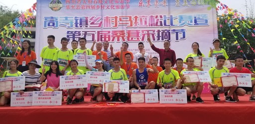 四川省樂至縣高寺鎮(zhèn)桑葚采摘節(jié)活動中“鄉(xiāng)村馬拉松比賽”獲獎者合影。趙彥成 攝