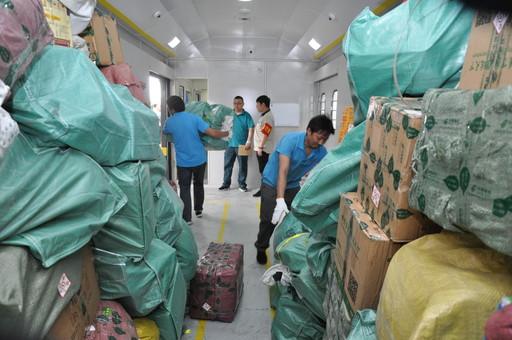 到達北京西站,工作人員抓緊時間卸下郵件。