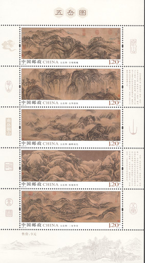 具體到設(shè)計細(xì)節(jié),王虎鳴首先談到選擇恰當(dāng)?shù)钠毙秃鸵?guī)格,《五岳圖》選用76毫米×30毫米的橫長票型,既是應(yīng)圖選型、量體裁衣,也是對過往同類題材郵票票型的突破,令人耳目一新。除此之外,還要考慮構(gòu)圖和版式,銘記和面值放在什么位置更合適,有些古畫還有題跋,怎樣將這些元素有機地組合在一起,這些都是設(shè)計師需要精心考慮的?!安灰】脆]票銘記的位置,它是郵票不可或缺的眼睛。如何使字體的大小顏色和古畫更加協(xié)調(diào),在同一個畫面中既突出古畫風(fēng)貌又彰顯銘記,其實很考驗設(shè)計者的功力。”《五岳圖》郵票的畫面布局嚴(yán)謹(jǐn),很難將面值、文字融入畫面中,所以王虎鳴便將所有文字置于郵票下方的白邊上,與郵票主圖獨立并存又互相統(tǒng)一,相得益彰。
