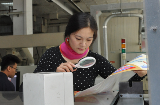 郵票設計者原藝珊查看郵票印制情況。陸航 攝