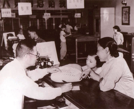 1958 年,東四郵局主動改善服務,資深營業(yè)員于洪澤(左一),是在舊中華郵政工作過22 年的郵務佐,深信不能替用戶寫字的老規(guī)矩沒有錯,經過服務思想教育,他告別了以前的自己,主動為用戶填寫單式。