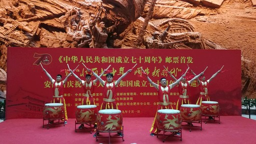 10月1日15時(shí),由中共安徽省委宣傳部、安徽省郵政管理局、安徽省郵政分公司、安徽省集郵協(xié)會(huì)、合肥市文化和旅游局主辦的《中華人民共和國(guó)成立七十周年》紀(jì)念郵票首發(fā)暨“壯麗七十年 闊步新時(shí)代”集郵巡展在渡江戰(zhàn)役紀(jì)念館舉行?;顒?dòng)中,安徽省分公司帶來(lái)了快閃表演《我和我的祖國(guó)》,全場(chǎng)同唱贊歌,歌頌祖國(guó)。圖為合肥市郵政分公司員工帶來(lái)的《鼓舞盛世 揚(yáng)帆遠(yuǎn)航》表演,強(qiáng)勁有力的鼓聲表達(dá)了慶祝新中國(guó)成立70周年的喜悅之情。(徐吉波 攝影報(bào)道)