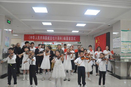 舉國(guó)歡慶之際,山西省晉城市郵政分公司隆重舉行《中華人民共和國(guó)成立七十周年》紀(jì)念郵票首發(fā)活動(dòng)。10月1日上午,百余名集郵愛(ài)好者早早來(lái)到澤州路營(yíng)業(yè)廳前自覺(jué)排隊(duì),翹首期盼。8時(shí),首發(fā)活動(dòng)在晉城市分公司合唱隊(duì)慷慨激昂的《歌唱祖國(guó)》歌聲中開(kāi)啟,兩位名為“國(guó)慶”的集郵愛(ài)好者被邀請(qǐng)為郵票揭幕?,F(xiàn)場(chǎng)還設(shè)立了臨時(shí)郵局,工作人員身著工裝,黨員佩戴黨徽,規(guī)范操作,有序引導(dǎo)。