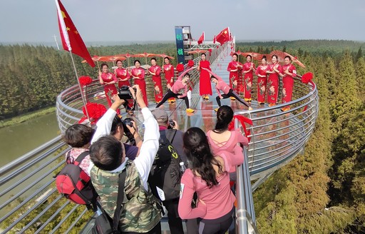 10月1日,江蘇省金湖縣郵政分公司工會與金湖電信分公司、金湖移動分公司工會一起,組織本單位部分女職工來到銀涂鎮(zhèn)萬畝水森林,開展了“郵電女職工與國旗同框”主題活動。郵電女職工們身著旗袍登上高33.18米、長288.18米的“樹梢王國”,與高高飄揚的國旗合影,慶祝新中國成立70周年?! 跫獱栐?nbsp; 攝影報道