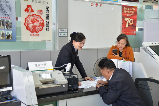 顧朝竹悉心為客戶辦理財(cái)產(chǎn)品購買登記手續(xù)。