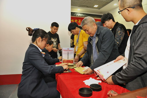 9月25日,“壯麗七十年 闊步新時代”慶祝新中國成立70周年全國集郵文化活動(太原站)暨山西省第十一屆集郵展覽拉開帷幕。此次郵展為全省綜合性郵展,規(guī)模為286框。持續(xù)三天的展覽,展出了以新中國成立70年來在政治、經(jīng)濟、文化、軍事等領(lǐng)域取得的偉大成就為主題的郵集,展品內(nèi)容豐富多彩。圖為郵政工作人員特別提供紀(jì)念戳加蓋服務(wù)。 □山西記者 裴效華 攝影報道