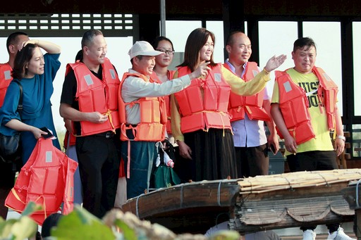 向游客介紹洪澤湖風光。