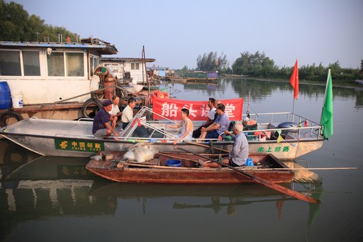 江蘇省淮安市洪澤區(qū)老子山鎮(zhèn)三面環(huán)水,300平方公里面積90%為灘涂水面。全鎮(zhèn)1.8萬居民中,六成左右是散居湖蕩灘頭、從事?lián)撇痘蝠B(yǎng)殖的漁民。簍,用繩子拴在腰上;娃,用繩子拴在船上;船,用繩子拴在岸上……漁民們常年過著“船底無刮子”的漂泊生活,內(nèi)心都渴望一處溫暖的港灣,危難時可以依靠,需要時獲得幫助。他們因此習慣在船上掛一面國旗,作為湖上生活的精神寄托以及四季平安的護身符?!八屈h派來的人?!痹跐O民們心中,唐真亞也是湖區(qū)的一面旗幟。