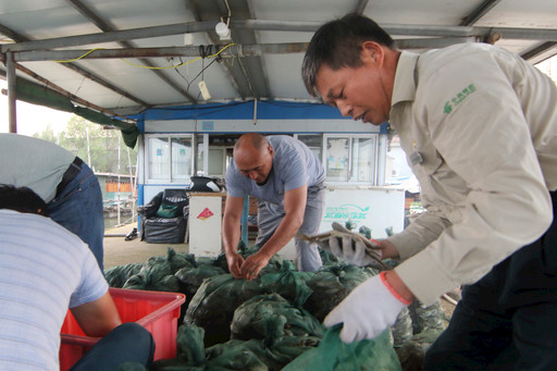 幫漁民捆扎大閘蟹。