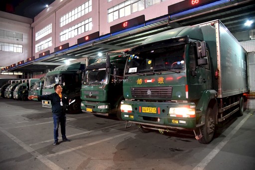 11月11日凌晨,湖北省武漢郵區(qū)中心局調(diào)度員楊成剛忙著指揮車輛進出垛口?! 鹾抡駥?nbsp; 攝影報道