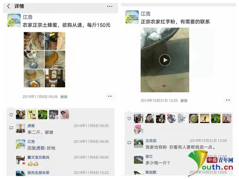 全縣23個鄉(xiāng)鎮(zhèn)的土豬、土雞、蜂蜜、葛根粉、干菜等土特產(chǎn)在他的朋友圈“輪番出售”?!稗r(nóng)家正宗土蜂蜜,預(yù)購從速,每斤150元?!苯衲辍半p11”之前,江浩在朋友圈“賣貨”,不一會兒便有買家留言,“來二斤,謝謝!”