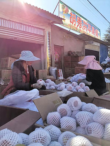 2015年,經(jīng)過培訓(xùn)后,老胡硬著頭皮開起了淘寶網(wǎng)店、郵樂網(wǎng)店?!班]政公司的人手把手教我。剛開始不懂營銷,我只能用傻辦法,見人就添加QQ好友、加微信,發(fā)網(wǎng)店地址,有時還免費寄給他們品嘗?!崩虾f,剛開始微信好友加了80多人,一年賣出兩萬多斤蘋果。