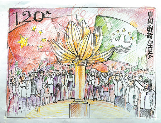 問及同為韓秉華設(shè)計(jì)的《澳門回歸祖國二十周年》與兩年前的《香港回歸祖國二十周年》郵票有什么變化,他表示:“整體風(fēng)格差不多,只是構(gòu)圖不一樣,澳門回歸的相對復(fù)雜一些,光是畫面中的人物就多了不少,場面顯得更為熱鬧?!?/p>